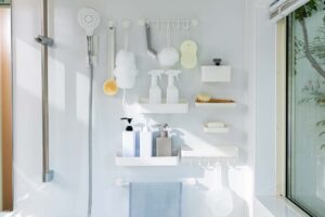 浴室には、シャンプーやソープ、ボディスポンジなど、いろいろなものを置いています。