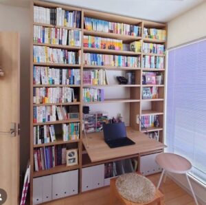 仕事や趣味に必要なものをデスクまわりの棚にたっぷり収納できて便利です。