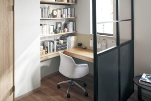 間仕切りを使ってセミクローズドな空間にする方法もあります。採光窓がついた間仕切りなら、窓からリビングの様子が見えるので、家族の気配を感じつつ集中しやすい場所になります。