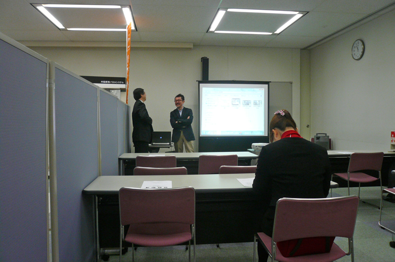事務の今枝、私、ジツダヤの野末君で、来場したお客様の案内と