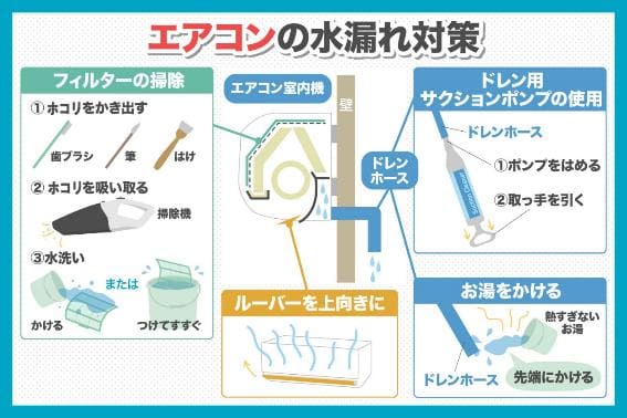 エアフィルターや内部の熱交換器が汚れると、結露水がうまく排出されず、吹き出し口や本体から水が漏れることがあります