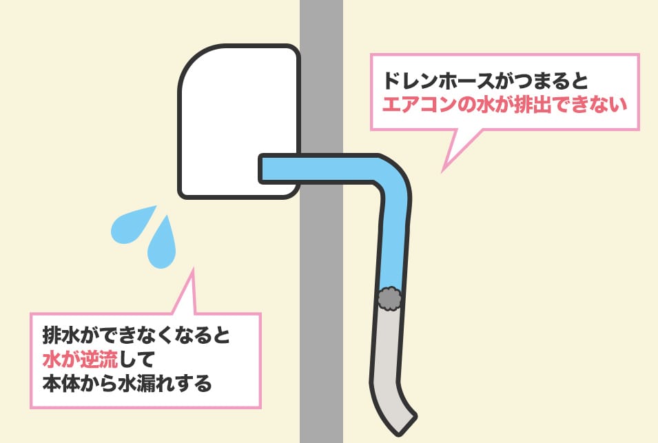 最も多い原因は、ドレンホース(排水ホース)の詰まりです。