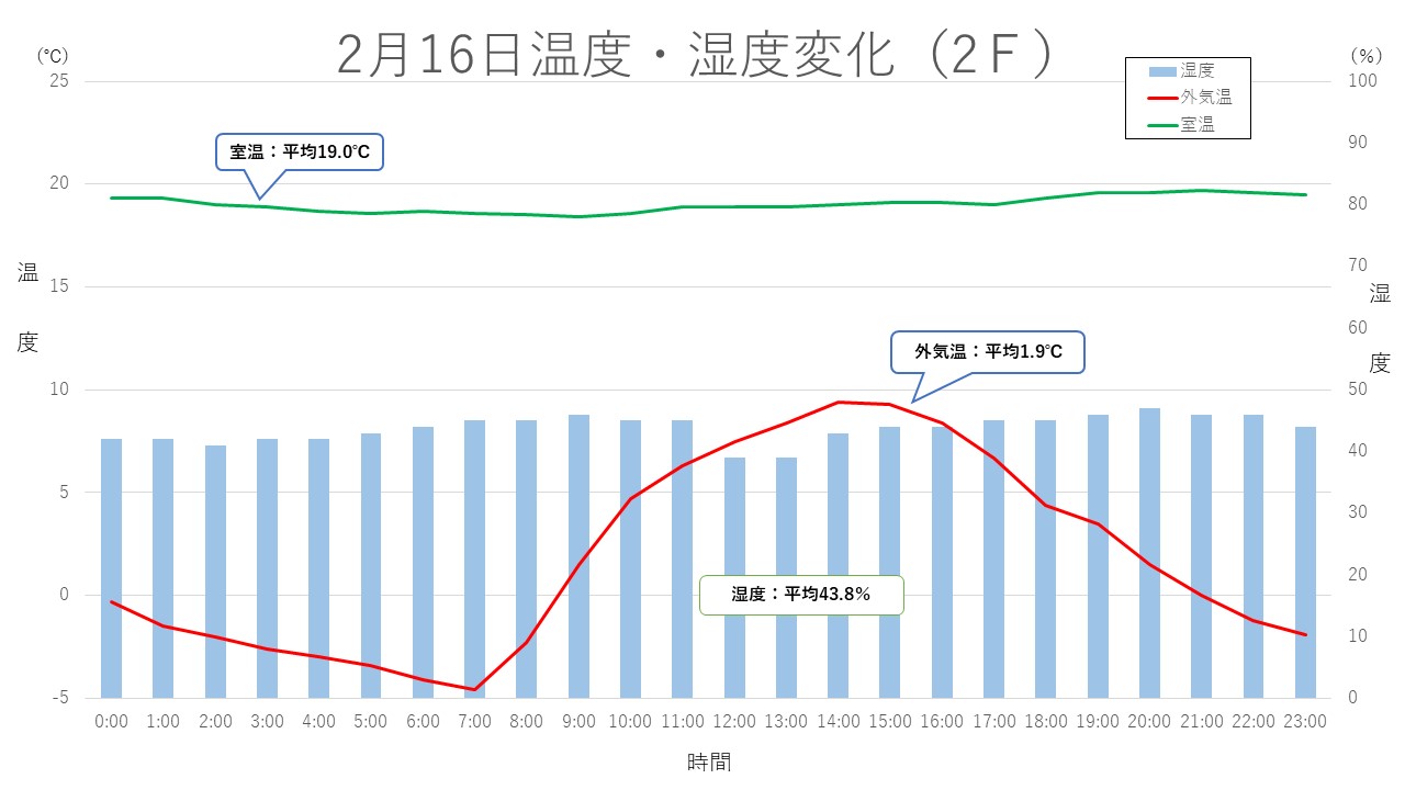 その時に室温測定もおねがいして、1階のLDKと、室内で一番寒いであろう2階の納戸の2か所で室温と湿度のデータを測定させていただいています。
