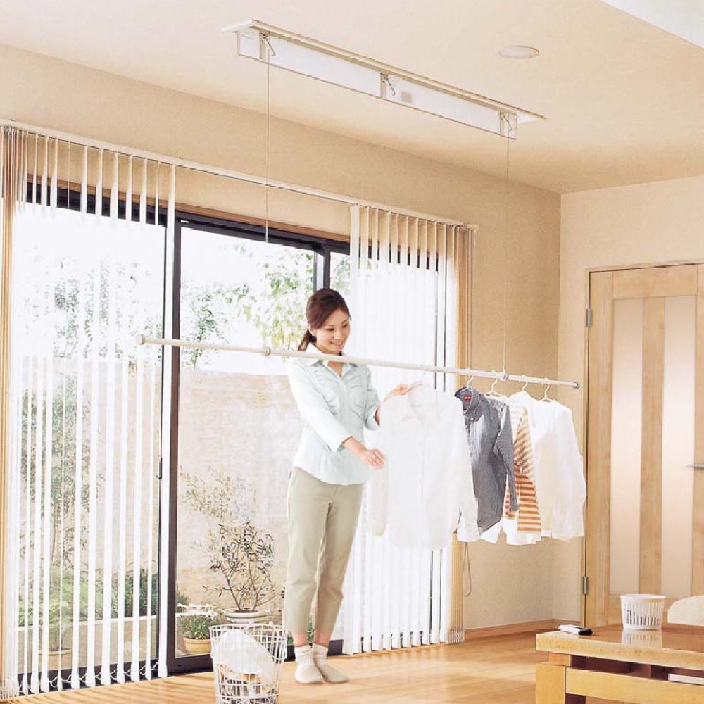 天井や壁から物干し竿を吊るせるので、床置きタイプの物干しと違って空間がすっきりします。