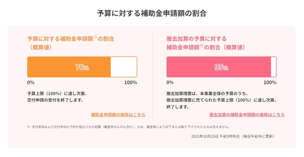 この補助金の、予算に対する補助金申請額の割合が10月25日現在95%なので来週中には打ち切りとなります。
