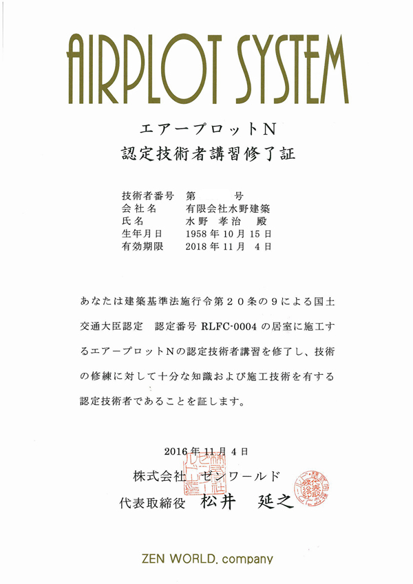 修了書を頂きましたので、私達で塗布することが出来ます。