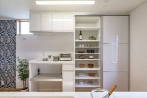たとえば、壁に棚を造り付けたり、キッチンの近くに高さのあるキャビネットを設置するだけでも、パントリーとして大活躍しますよ。
