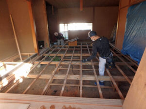 床は畳から無垢のパイン材のフローリングにします。断熱材はスタイロフォームt=60+高性能グラスウール42ミリを木材の間に充填します。