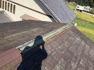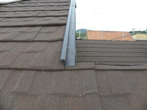 現場に行くと、屋根の棟の部分の水切りがありませんでした。風で飛ばされた可能性が高いです。