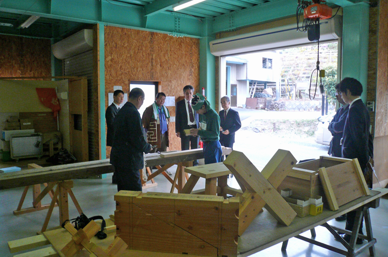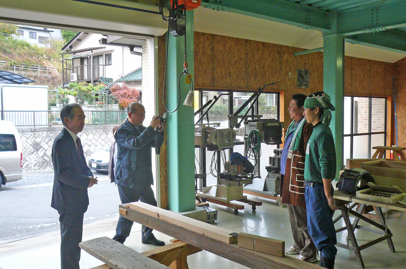 当社の作業場にて指導棟梁が墨付け・刻み・削りなどを