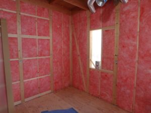 裸のグラスウールは隙間なくしっかり断熱材を詰めることができます。