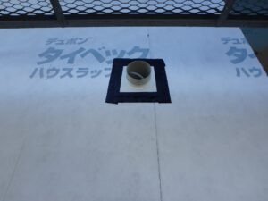合板を取付けた後に「タイベックスマート」というシートを張ります。