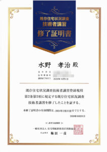 本日、修了証明書と既存住宅状況調査技術者登録証が届きました。