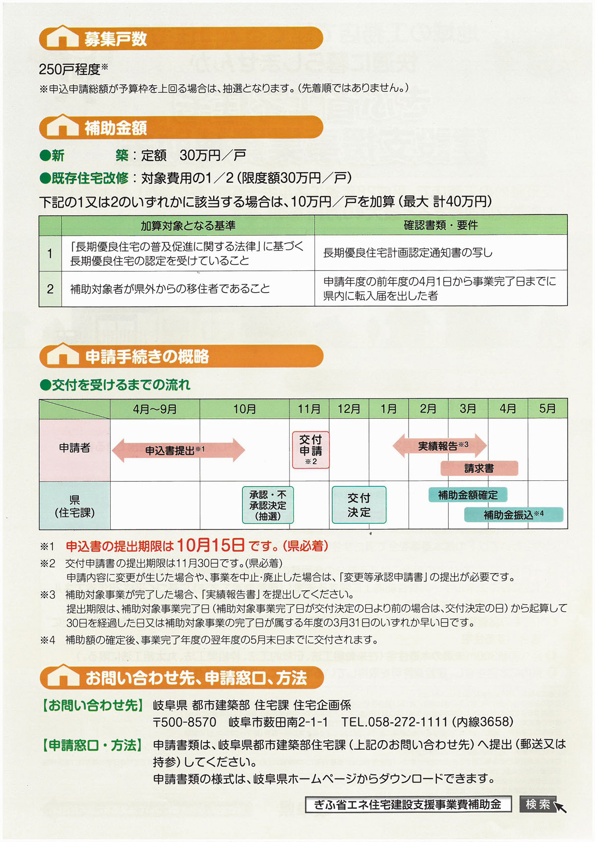 岐阜県内で、長期優良住宅の認定を取得された方や、性能のいい住宅を計画されている方は是非、申請してください。