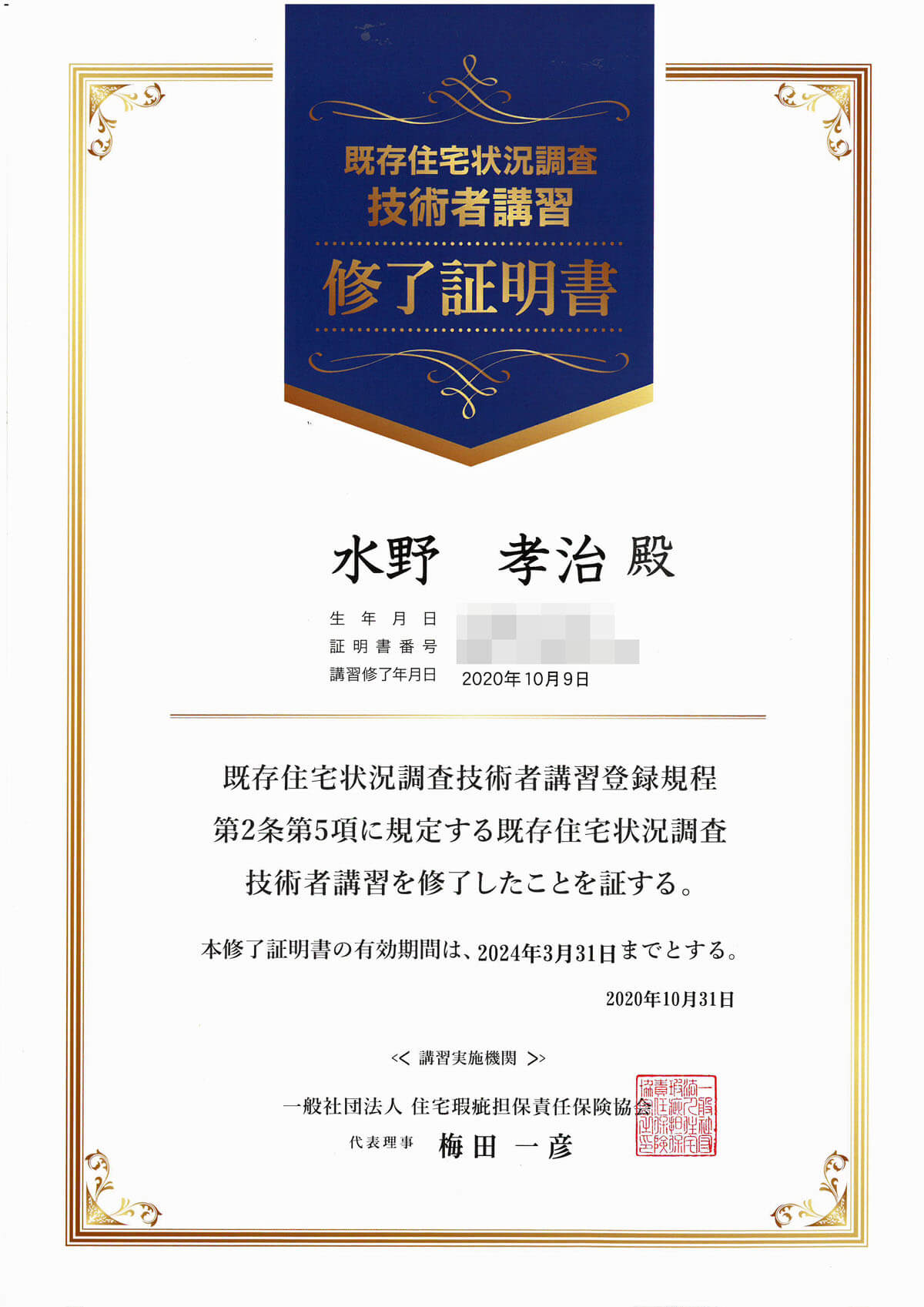 9月9日(水)に名古屋の千種で行われた既存住宅状況調査技術者の更新講習で、考査の結果は合格しました。 本日、修了証明書と既存住宅状況調査技術者登録証が届きました。 これで2024年3月31日までの有効期限となりました。 […]