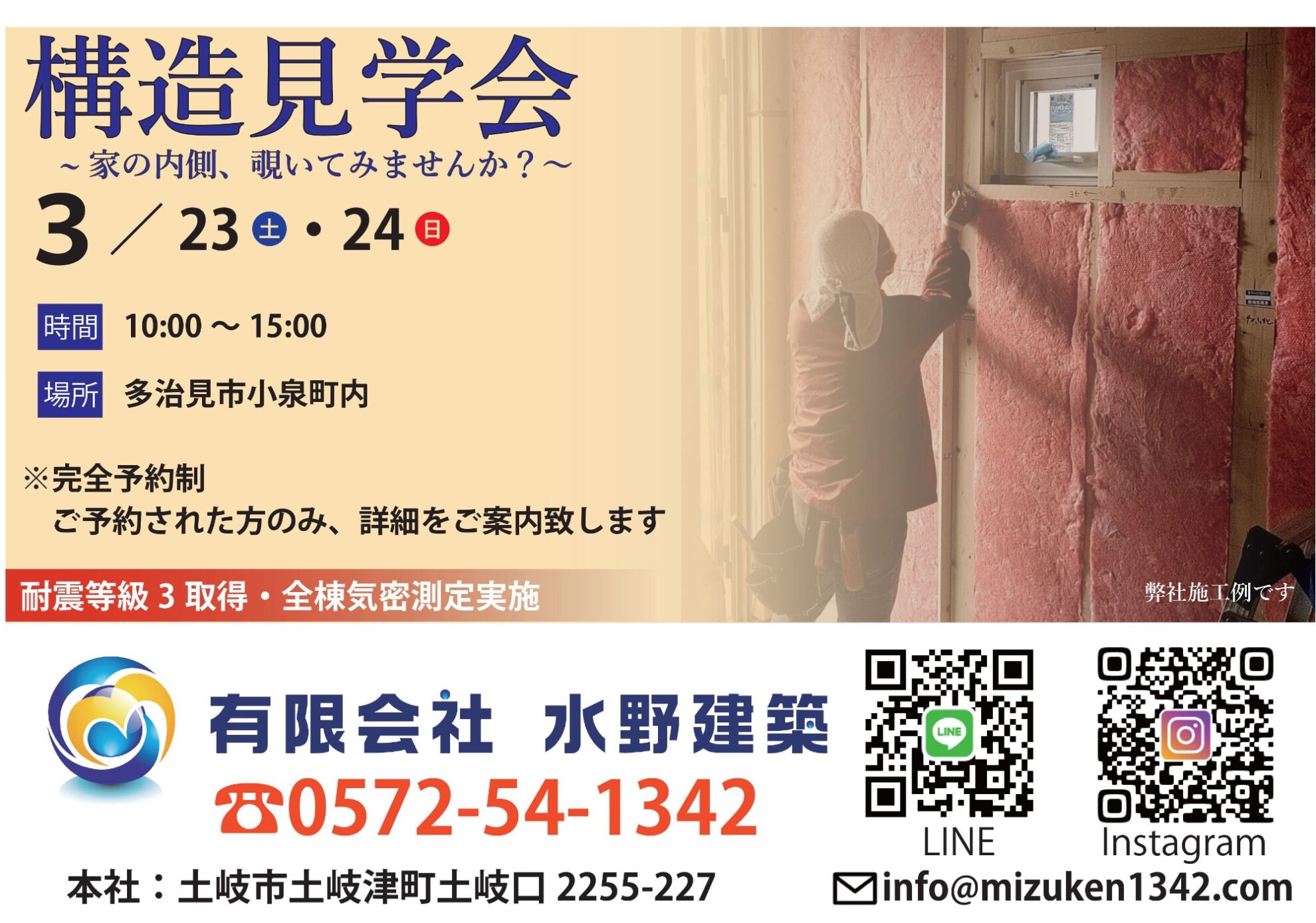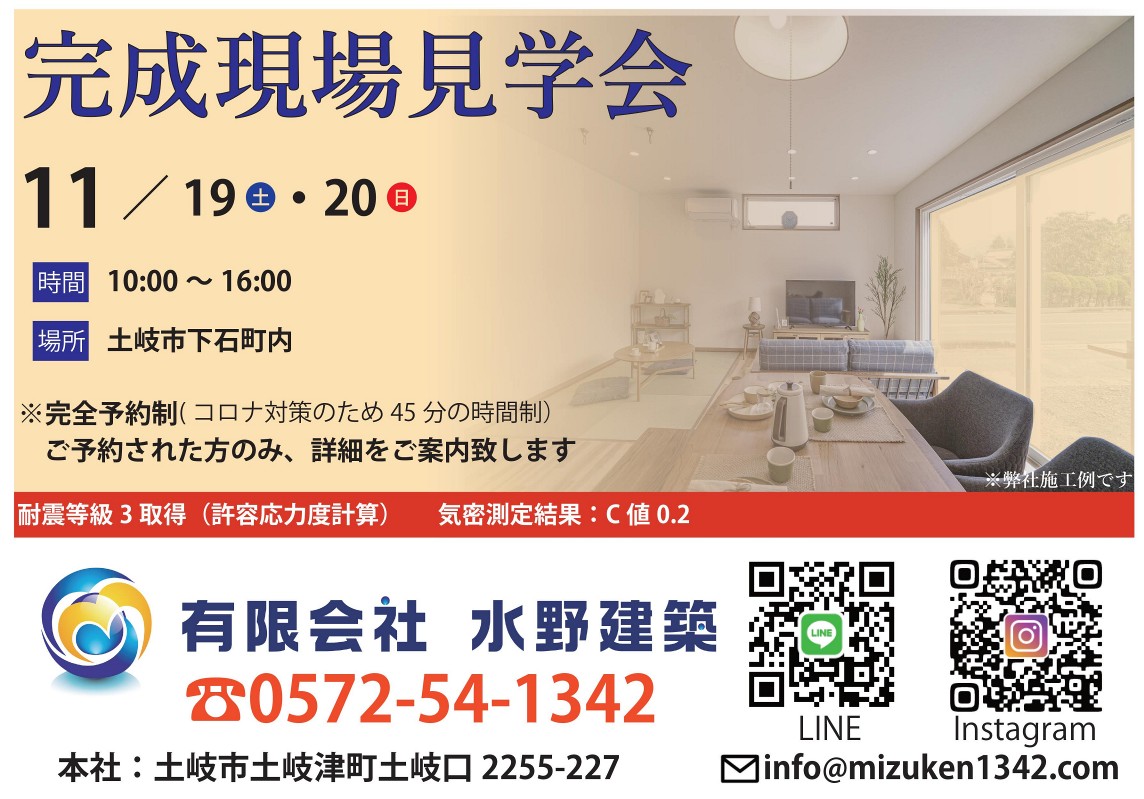 12月14日(土)・15日(日)は、性能向上リノベーション完成見学会です! 会場は多治見市滝呂町です。 ご家族3人が安心して快適に暮らせる家へのリノベーション工事が完成しました! 明るく暮らしやすいお住まい […]