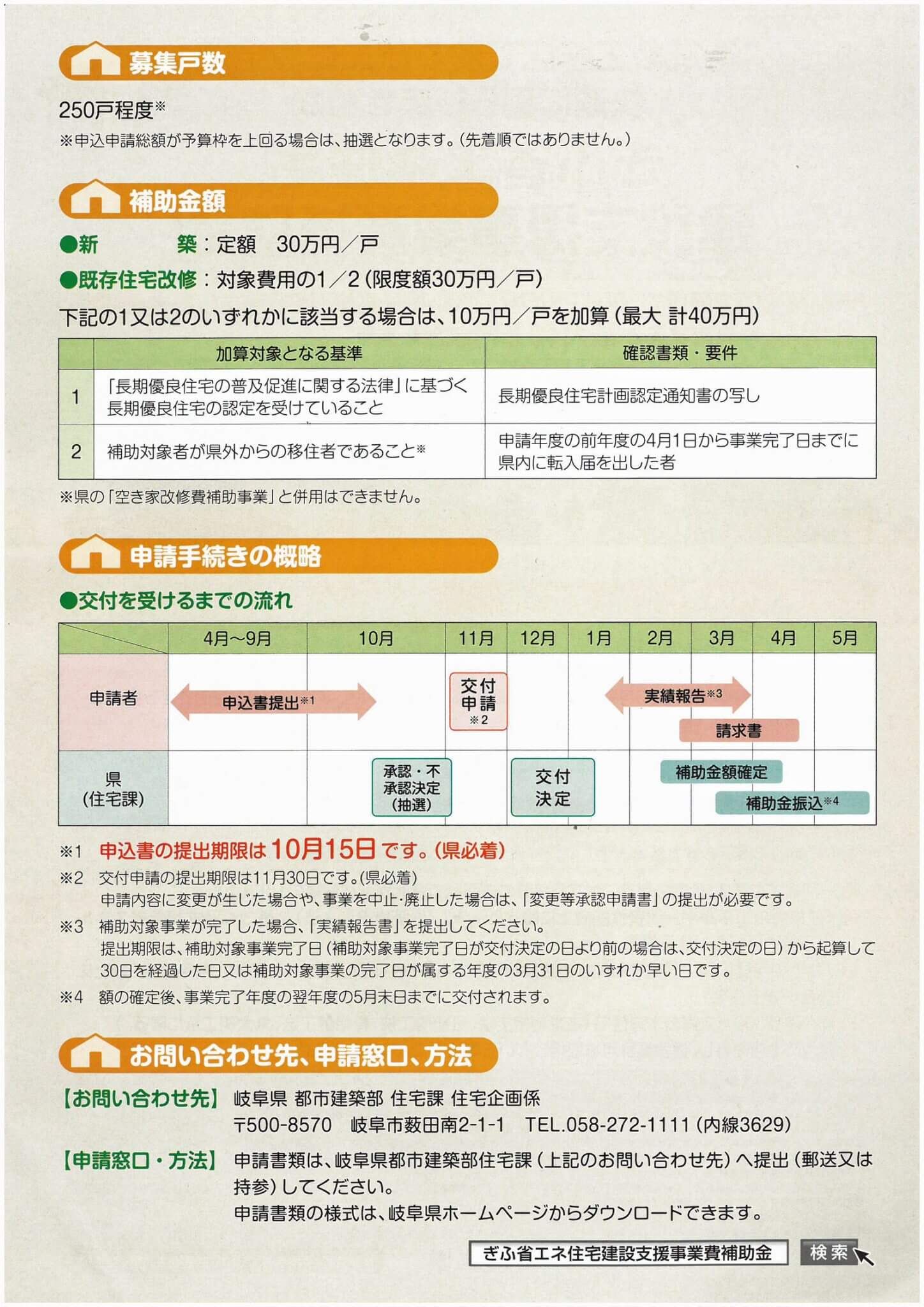 この補助金は、岐阜県内の新築工事や既存住宅の改修において、省エネ基準と劣化対策基準が一定の性能を満たしているものについて補助をするというものです。