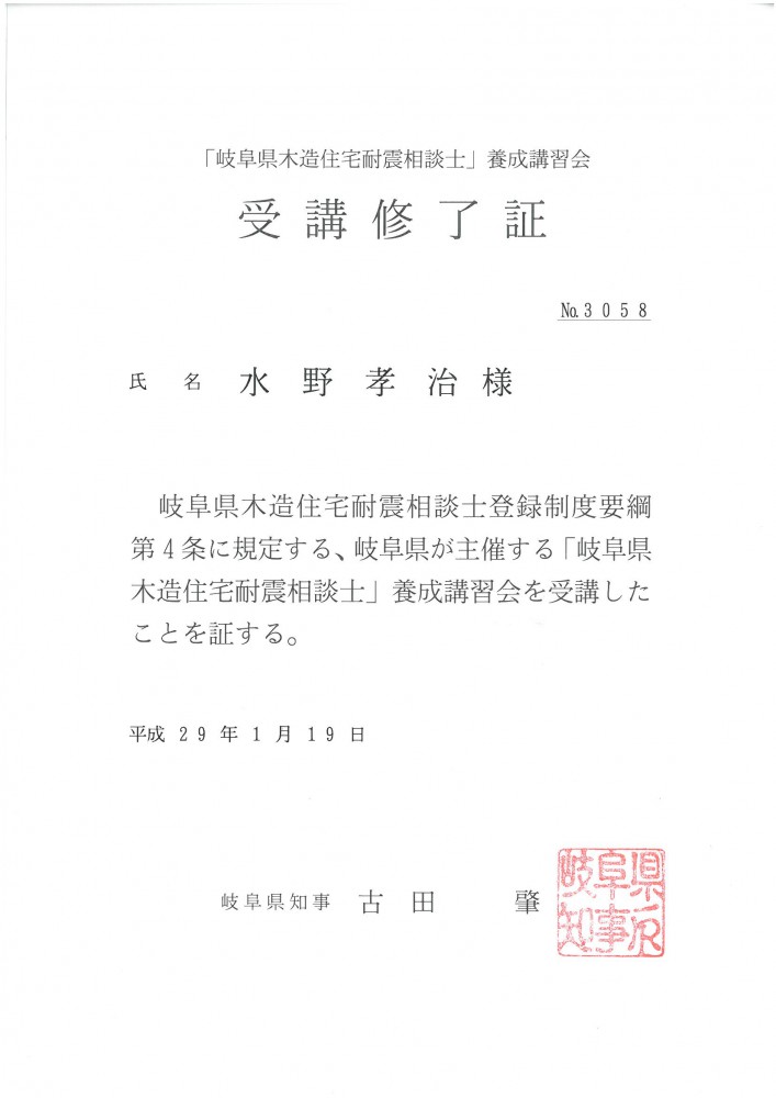 私と暢也は「岐阜県木造住宅耐震相談士」として登録されました。