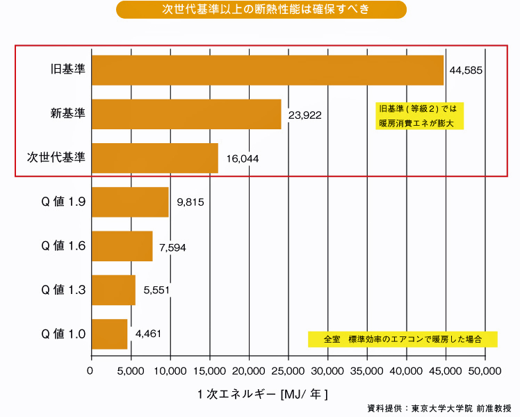 外皮の断熱性能を上げるのは、暖房設備一次エネルギー削減に絶大の効果があります。