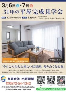 見学できるのは、水野建築が誇る、高耐震・高気密・高断熱住宅です。