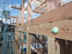・建て方時に桁上断熱をするために、気密テープを貼り付け構造用合板を敷くことで外部で気密が取れます。