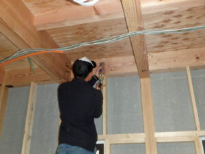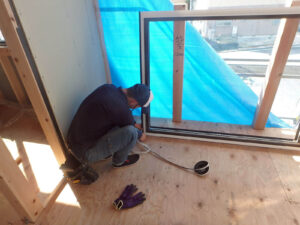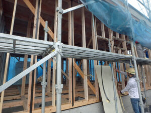 水野建築では気密を確保するために、外部では構造用面材で気密処理をして、内部でも気密シートで気密処理をします。