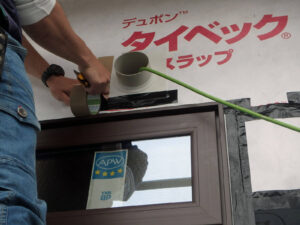 ・サッシを取り付ける前に、あらかじめサッシのツバの部分に気密テープを貼り付けます。