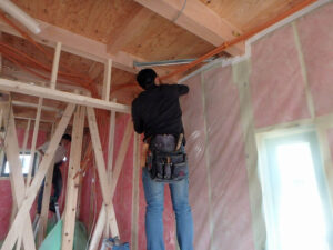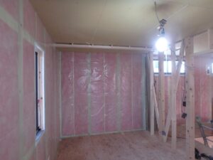土岐市泉西窯町I様邸では、断熱気密工事が終わり大工さんは天井、床、壁の工事に入っています。