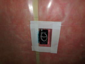 ・配管貫通部には「ドームパッキン」という商品を取付けて、周囲を防水テープで張ります。この方法は防水対策にもなります。(室内と室外の両方です)