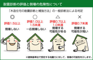 耐震診断では、この3つのポイントを総合的に評価し、現行の耐震基準と比べて、どれくらいの耐震性能をもった建物であるかを評点で表します。