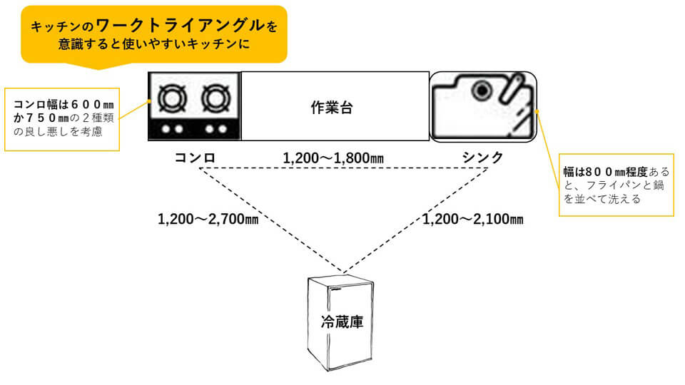 使いやすいキッチンはワークトライアングルの距離の合計が360cm~600cmと言われています。