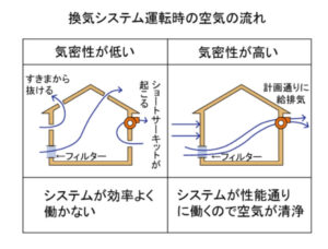 ただし、建物に隙間が多いと、そこから隙間風が出入りするため、換気設備が効率よく機能しません。換気が機能しないと、換気量がやたら多く寒い場所や、換気されず空気が汚れたままの場所などが混在します