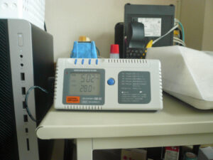 事務所に設置してある二酸化炭素測定器(部屋を締め切った状態で2人いれば45分で1000ppmを超えますよ)