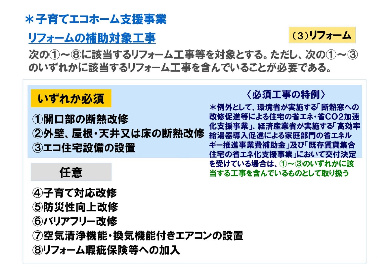 リフォームには「必須工事」があります。かつ、1申請当たりの補助額が5万円以上で申請可能となりますので、この2つに注意が必要です。