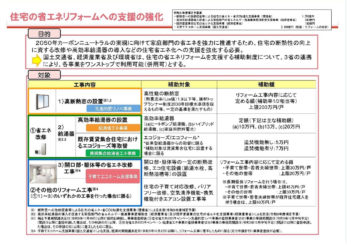 この補助金は、2023年9月に終了した「こどもエコすまい支援事業」を引き継ぐカタチとして、「子育てエコホーム支援事業」が発表されました。