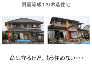 お客様に伝えることは、命を守るけど、もう住めなくなる住宅 耐震等級1(耐震等級2も倒壊、損傷しています・・)命も財産も守り、住み続けることができる住宅 耐震等級3どちらが良いですか?