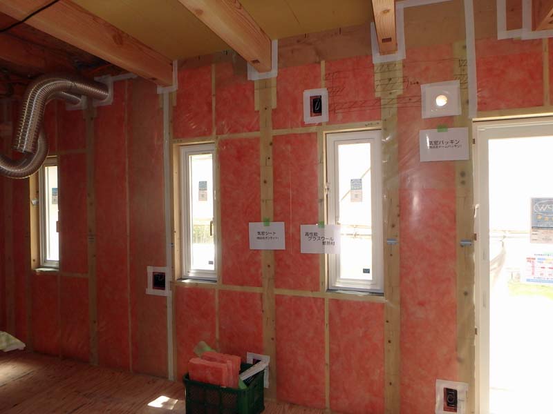 壁の充填部分の断熱施工です。防湿シートも綺麗です