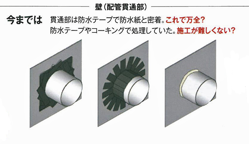 通常は、貫通部は防水テープやコーキングで処理しています。