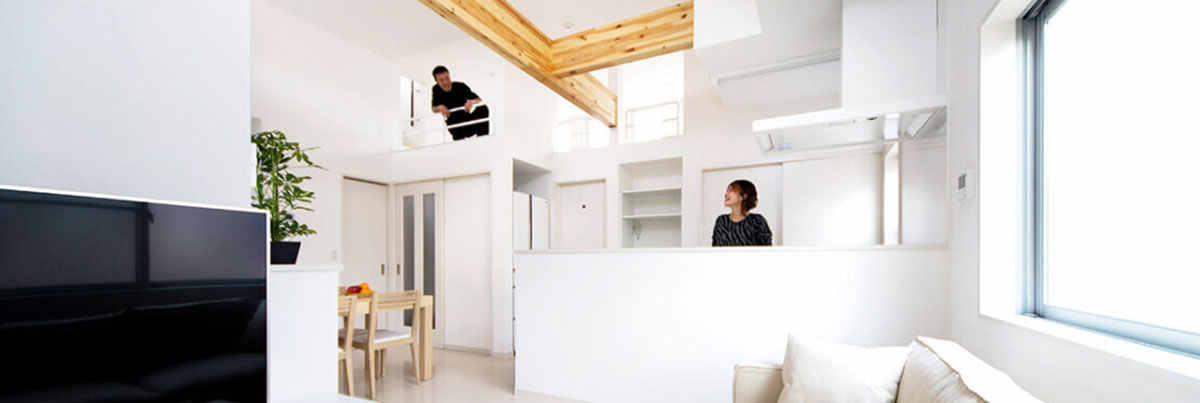 家づくりの際、空間の広さや開放感を重要視する方も多いと思います。でも、そのための広大な土地を準備できない、というお声をたくさん頂いてきました。水野建築では、そんな方に向けて「ナナメウエのイエ」をご提案しています。「ナナメウエのイエ」は、空間を立体的に最大限活用した住宅ブランドです。