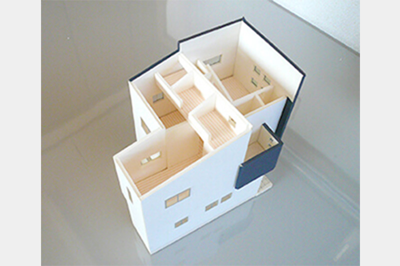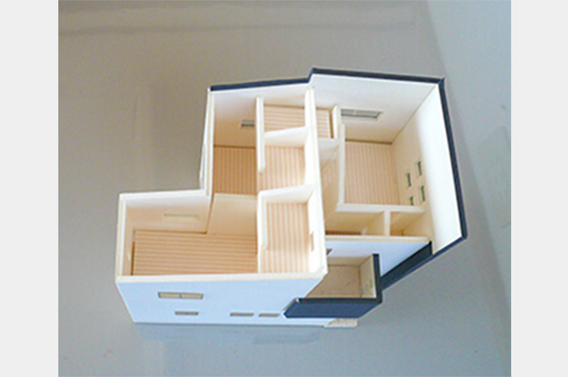 ナナメウエのイエの基本は、対角線を意識した縦横の空間づくり。縦、横を少しずらすと広くなるのですが、これが難しいのです。
