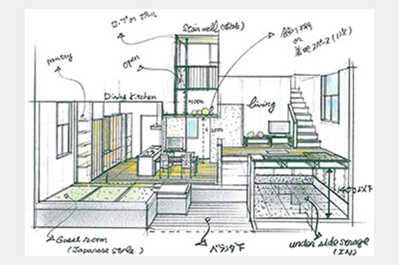 それは、部屋ごとや区画ごとにあえて高さを変え、プラスαのスペースを生んでいるからです。通常の住宅は、「縦×横」の平面での設計を行います。しかし、空間の広さには、「高さ」が関係してきます。この「高さ」を意識した設計を行うことで、家全体で活用可能なスペースを生み出すのが、ナナメウエのイエの仕組みです。