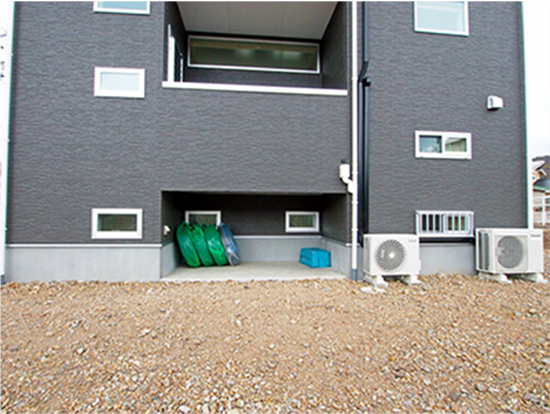 中2階ベランダの下は、自転車置き場やタイヤ置場に使えます。ナナメウエのイエによる有効スペースの一つです。イ○バの物置を買わなくていいんですよ!