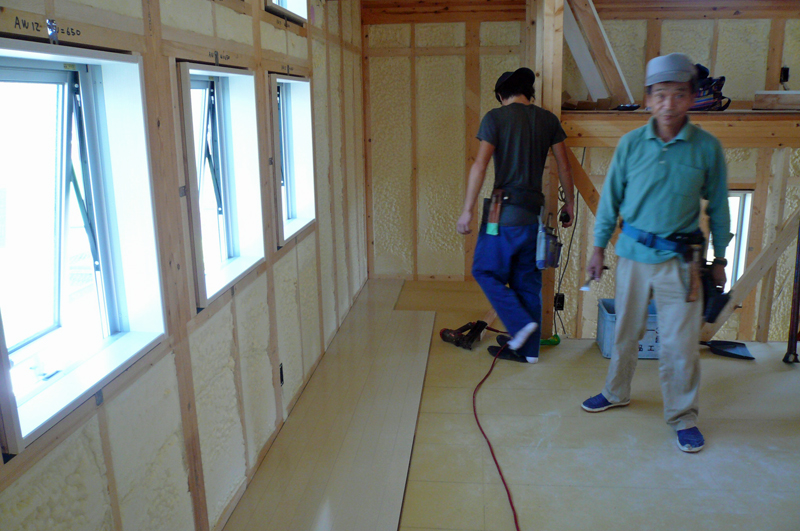 合板の上にプラスターボードを張ってから、複合フローリングを貼ります。