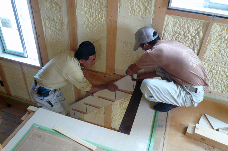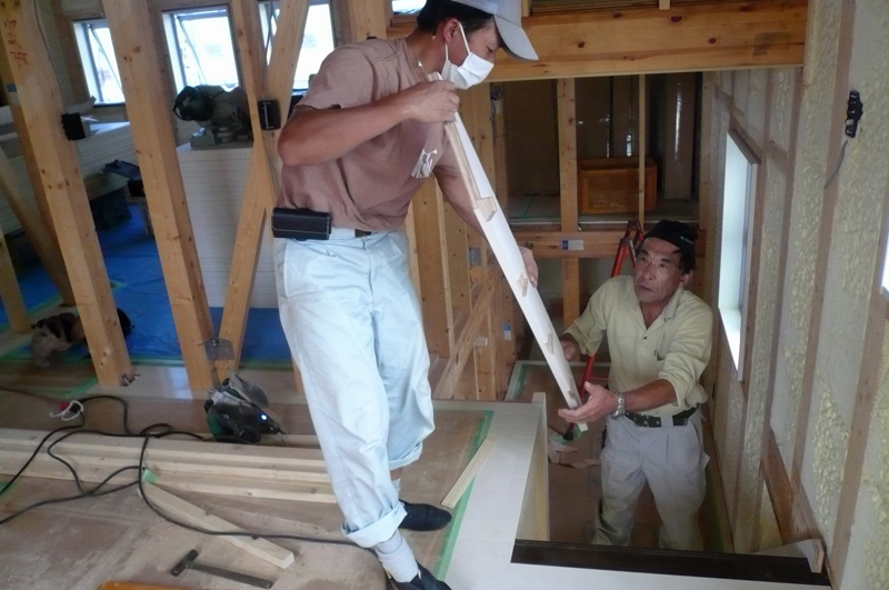 そんな中、先輩大工さんから階段の取付を教わっている平林君(大工歴7年)です。