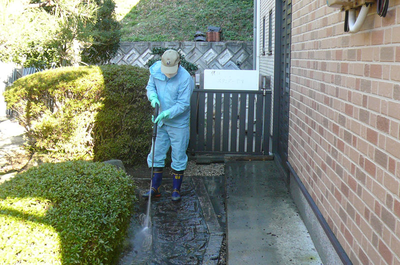 そして、高圧洗浄機で玄関アプローチの石を洗浄します