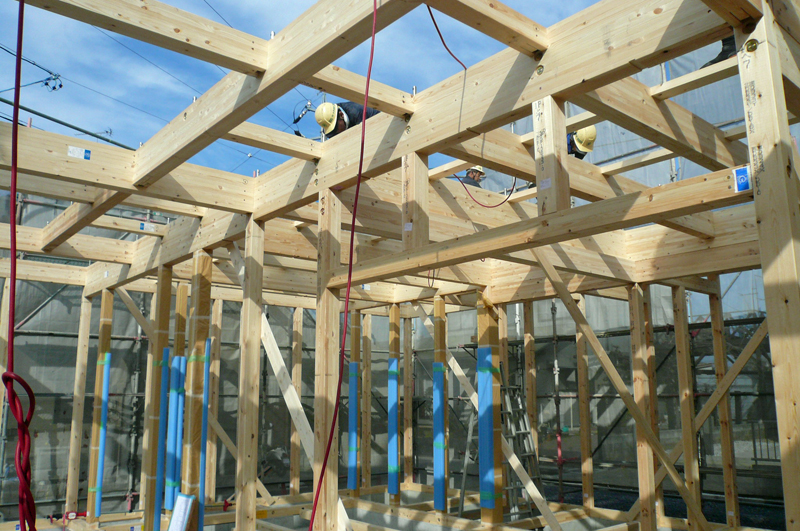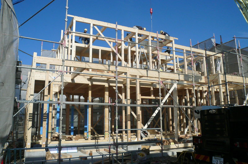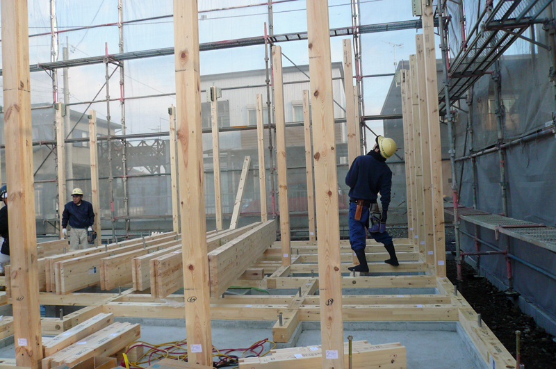 工場で加工された材木が建築現場に運ばれてきます。