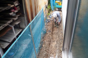 建物外部では、足場を解体しましたので、水道屋さんが外部の給排水工事に入りました。