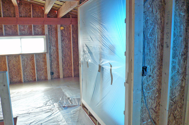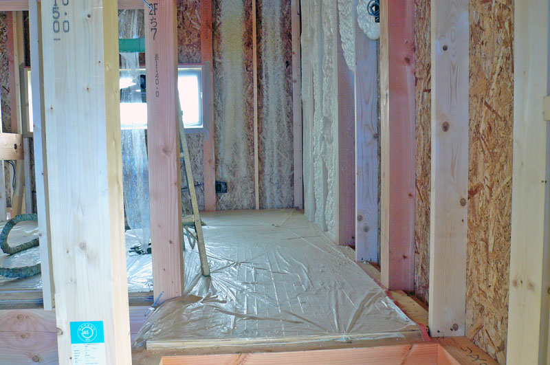 建物内部をシートを張って発砲ウレタンが付着しないように養生をします。