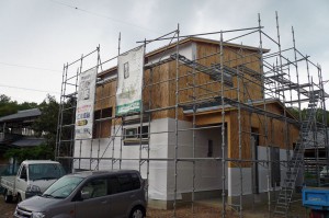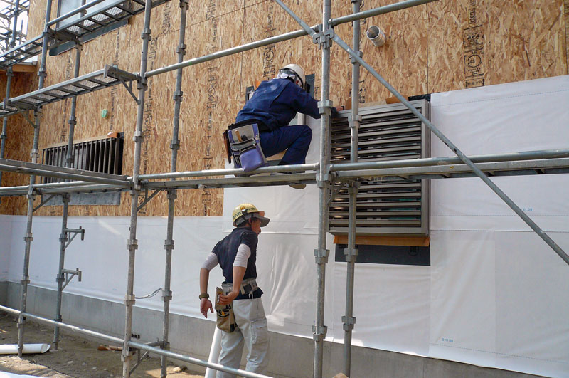 システムバスルームの設置工事、外装下地工事をしています。