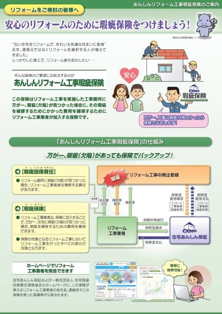 リフォーム瑕疵(かし)保険とは、リフォーム時の検査と保証がセットになった保険制度です。住宅専門の保険法人が保険を引き受けます。